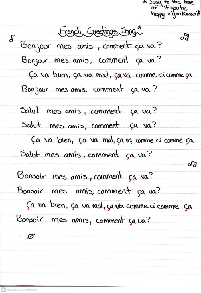 This week I focused on learning a French song to teach students (and myself) a conversational greeting and several responses in a fun and engaging manner! Here is my practice run-through of the song below: